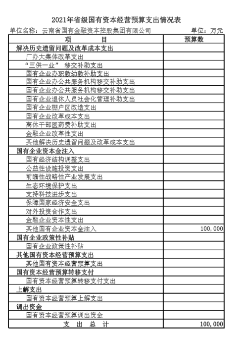 根據(jù)《云南省財(cái)政廳關(guān)于批復(fù)云南省國有金融資本控股集團(tuán)有限公司2021年省級(jí)國有資本經(jīng)營預(yù)算的通知》(云財(cái)金〔2021〕18號(hào))要求,現(xiàn)將我公司2021年國有資本經(jīng)營預(yù)算情況公示如下: