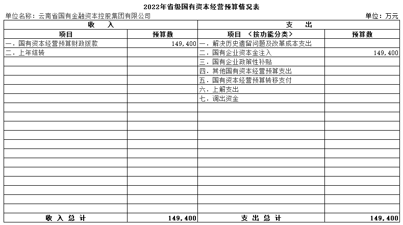?根據(jù)《云南省財政廳關(guān)于批復(fù)2022年省級國有資本經(jīng)營預(yù)算的通知》(云財資〔2022〕1號)要求,現(xiàn)將我公司2022年國有資本經(jīng)營預(yù)算情況公示如下: