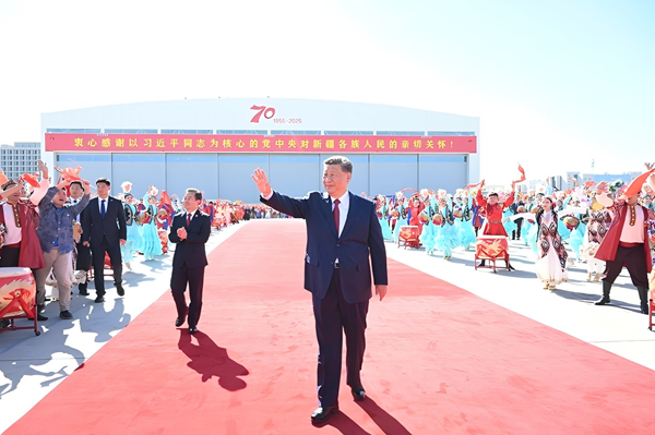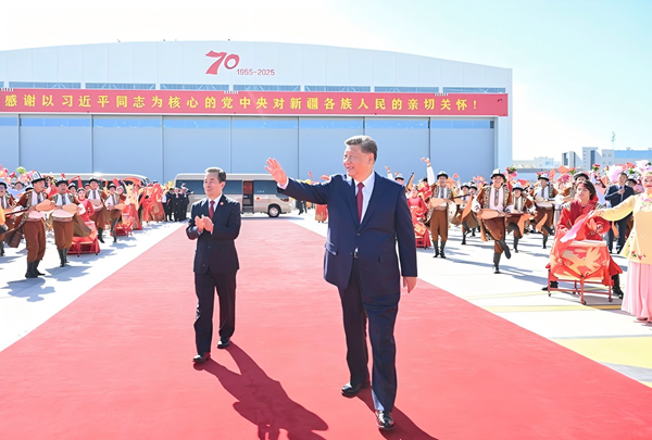 中共中央總書記、國家主席、中央軍委主席習(xí)近平在烏魯木齊出席新疆維吾爾自治區(qū)成立70周年慶?;顒?dòng)后,25日乘專機(jī)返回北京。受習(xí)近平總書記囑托,以王滬寧為團(tuán)長的中央代表團(tuán)將于25日至28日在新疆各地看望慰問各族各界干部群眾。