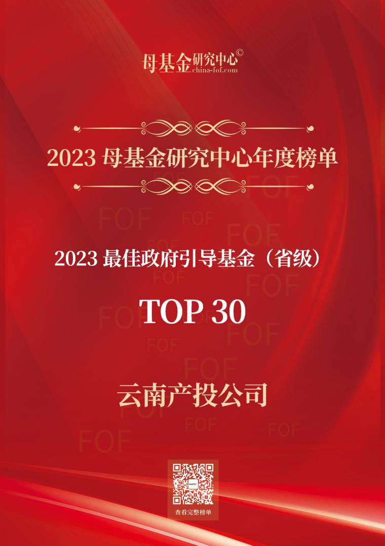 2023年12月11日,中國母基金研究中心正式發(fā)布2023年度榜單,集團所屬云南產(chǎn)投公司榮登“2023最佳政府引導(dǎo)基金(省級)Top 30”榜單,這是公司連續(xù)三年榮獲該獎項。