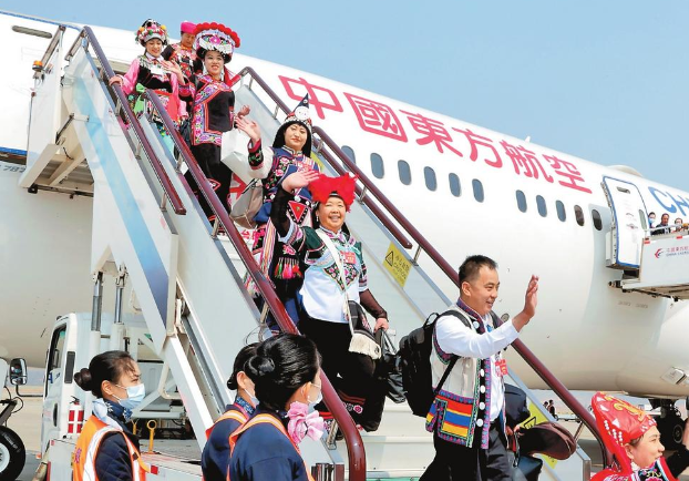3月12日,出席十四屆全國人大二次會議的在滇全國人大代表圓滿完成大會各項議程,乘機返回昆明。周燦 攝