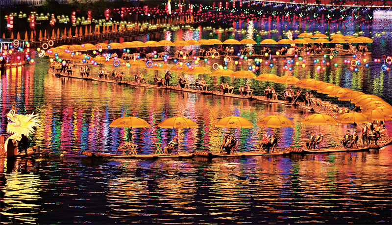 蛇年春節(jié),全國各地張燈結彩,人們參加各種喜慶活動,紅紅火火迎新春。圖為2025年1月21日晚,游客在湖北省宣恩縣貢水河中乘坐竹筏賞夜景。新華社發(fā) 宋文/攝?