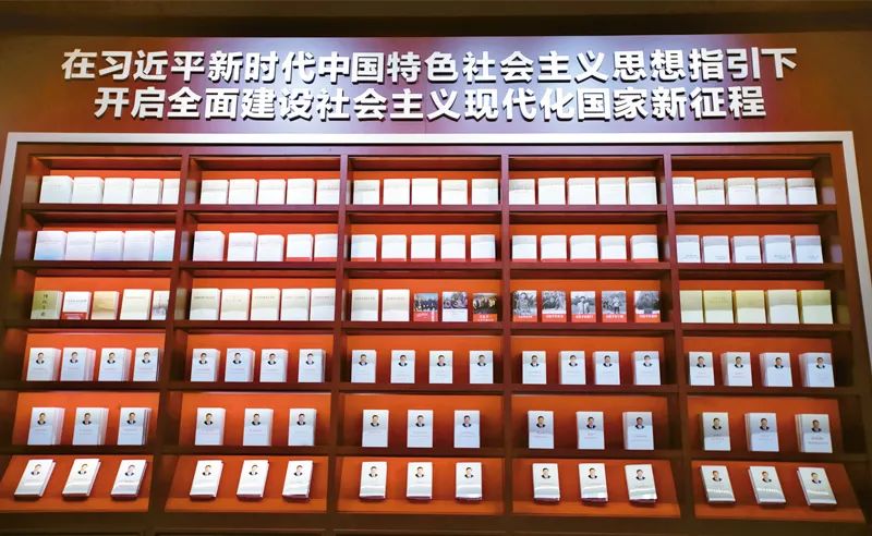圖為中國共產(chǎn)黨歷史展覽館展出的習(xí)近平總書記的部分重要著作以及學(xué)習(xí)闡釋習(xí)近平新時代中國特色社會主義思想的部分重點(diǎn)圖書。劉新武/攝