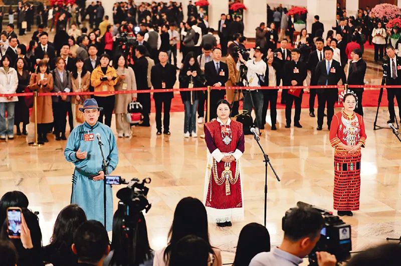 2025年3月10日,全國政協(xié)十四屆三次會議第三場“委員通道”在人民大會堂舉行。圖為少數(shù)民族委員亮相“委員通道”。?民族畫報記者 康夢婷/攝