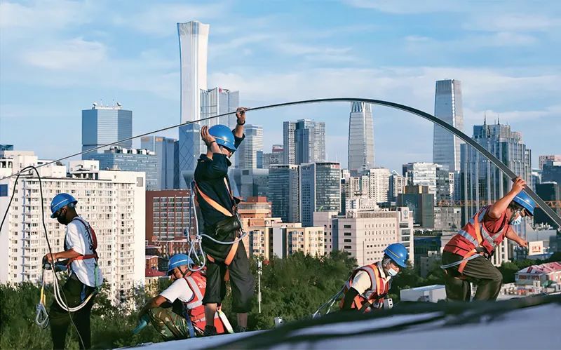 圖為2022年7月18日,在北京工人體育場改造復(fù)建工程的頂棚上,工人在太陽的余暉下作業(yè)。 工人日報記者 吳凡/攝
