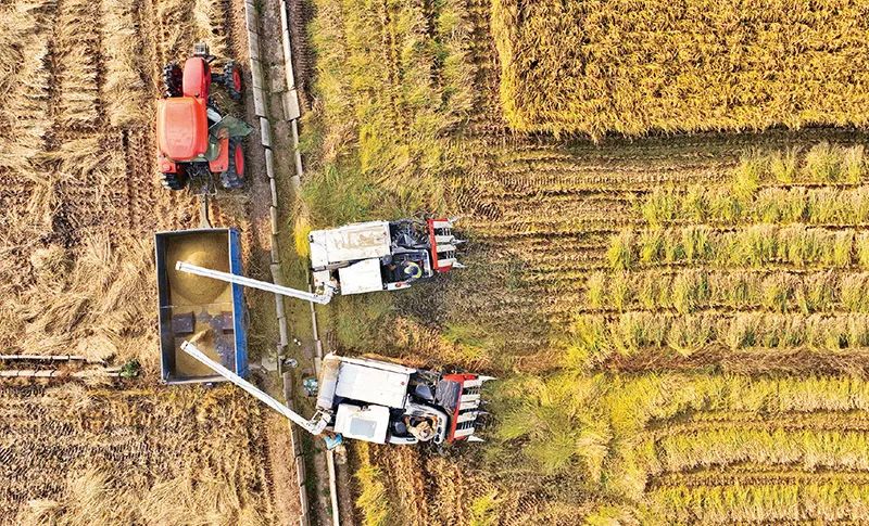 2023年,我國糧食總產(chǎn)量再創(chuàng)歷史新高,連續(xù)9年保持在1.3萬億斤以上。圖為2023年10月12日,在遼寧省燈塔市東古城子村,水稻收割機(jī)將收割的稻谷裝車。 新華社記者 楊青/攝