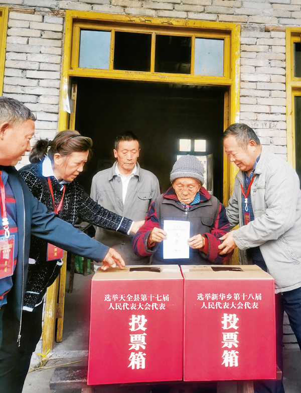 從2021年上半年起,全國(guó)縣鄉(xiāng)兩級(jí)人大換屆選舉陸續(xù)展開(kāi)。就在中央人大工作會(huì)議結(jié)束后的第二天,四川省雅安市天全縣新華鄉(xiāng)永安村8組的106歲老人李朝蘭,迎來(lái)了她人生中的第18次換屆選舉投票——這一天,她依法行使自己的權(quán)利,為產(chǎn)生新一屆縣鄉(xiāng)兩級(jí)人大代表投出寶貴一票。圖為李朝蘭老人鄭重投出選票?!∪珖?guó)人大常委會(huì)供圖 楊愛(ài)玲/攝