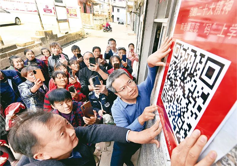 ?圖為2022年11月13日,江西省鄱陽縣雙港鎮(zhèn)黨員干部將宣講黨的二十大精神的二維碼貼在村頭,吸引不少村民前來掃碼學習了解有關(guān)知識。 中新社發(fā) 卓忠偉/攝