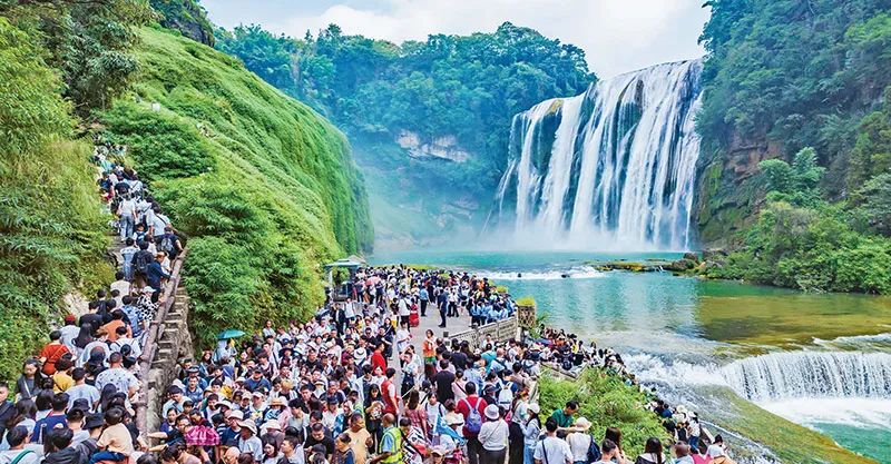 推動(dòng)高質(zhì)量發(fā)展,需要著力擴(kuò)大國(guó)內(nèi)需求,激發(fā)有潛能的消費(fèi)。圖為2023年10月3日,游客在貴州省安順市黃果樹(shù)瀑布景區(qū)游玩。新華社發(fā) 陳熙/攝