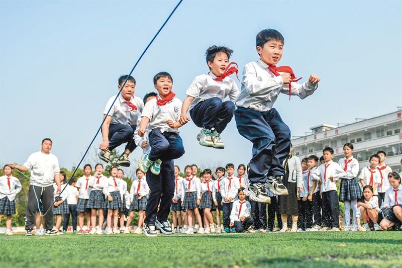 近年來,各地中小學(xué)積極落實(shí)“健康第一”教育理念,實(shí)施學(xué)生體質(zhì)強(qiáng)健計(jì)劃,讓學(xué)生更加健康、陽光、自信地成長(zhǎng)。圖為2025年3月25日,湖南省永州市道縣朝陽小學(xué),學(xué)生們?cè)谡n間跳長(zhǎng)繩。 人民圖片 蔣克青/攝