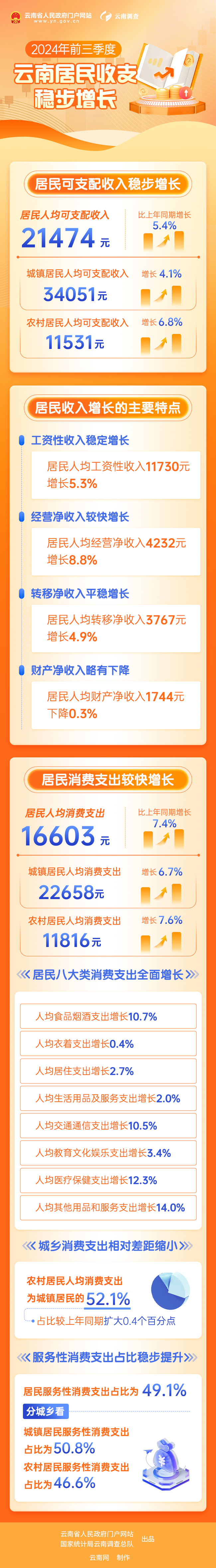 前三季度云南居民人均消費支出16603元,比上年同期增長7.4%。城鎮(zhèn)居民人均消費支出22658元,增長6.7%。農(nóng)村居民人均消費支出11816元,增長7.6%。
