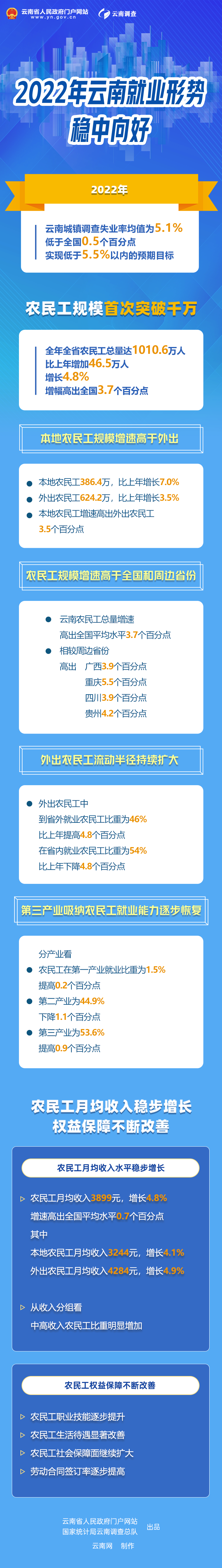 國(guó)家統(tǒng)計(jì)局云南調(diào)查總隊(duì)根據(jù)國(guó)家現(xiàn)行統(tǒng)計(jì)調(diào)查制度規(guī)定依法開展的相關(guān)調(diào)查結(jié)果顯示:2022年,云南城鎮(zhèn)調(diào)查失業(yè)率均值為5.1%,低于全國(guó)0.5個(gè)百分點(diǎn),實(shí)現(xiàn)了低于5.5%以內(nèi)的預(yù)期目標(biāo)。全年全省農(nóng)民工總量達(dá)到1010.6萬(wàn),比上年增加46.5萬(wàn)人,增長(zhǎng)4.8%,增幅高出全國(guó)3.7個(gè)百分點(diǎn),實(shí)現(xiàn)了就業(yè)穩(wěn)、民生穩(wěn)。