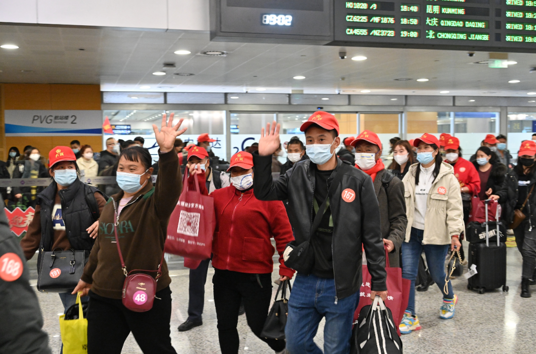 2023年1月30日,云南大理的務(wù)工人員抵達(dá)上海浦東國(guó)際機(jī)場(chǎng)。圖源:視覺(jué)中國(guó)