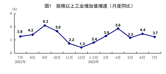 7月份,全國(guó)規(guī)模以上工業(yè)增加值同比增長(zhǎng)3.7%,環(huán)比增長(zhǎng)0.01%。分三大門(mén)類(lèi)看,采礦業(yè)增加值同比增長(zhǎng)1.3%,制造業(yè)增長(zhǎng)3.9%,電力、熱力、燃?xì)饧八a(chǎn)和供應(yīng)業(yè)增長(zhǎng)4.1%。原材料制造業(yè)增加值同比增長(zhǎng)8.8%,比上月加快2.0個(gè)百分點(diǎn)。分經(jīng)濟(jì)類(lèi)型看,國(guó)有控股企業(yè)增加值同比增長(zhǎng)3.4%;股份制企業(yè)增長(zhǎng)5.0%,外商及港澳臺(tái)商投資企業(yè)下降1.8%;私營(yíng)企業(yè)增長(zhǎng)2.5%。分產(chǎn)品看,太陽(yáng)能電池、新能源汽車(chē)產(chǎn)品產(chǎn)量同比分別增長(zhǎng)65.1%、24.9%。1-7月份,全國(guó)規(guī)模以上工業(yè)增加值同比增長(zhǎng)3.8%。7月份,制造業(yè)采購(gòu)經(jīng)理指數(shù)為49.3%,企業(yè)生產(chǎn)經(jīng)營(yíng)活動(dòng)預(yù)期指數(shù)為55.1%。