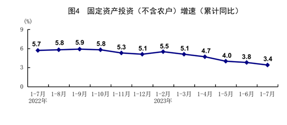 1-7月份,全國(guó)固定資產(chǎn)投資(不含農(nóng)戶(hù))285898億元,同比增長(zhǎng)3.4%。分領(lǐng)域看,基礎(chǔ)設(shè)施投資同比增長(zhǎng)6.8%,制造業(yè)投資增長(zhǎng)5.7%,房地產(chǎn)開(kāi)發(fā)投資下降8.5%。全國(guó)商品房銷(xiāo)售面積66563萬(wàn)平方米,同比下降6.5%;商品房銷(xiāo)售額70450億元,下降1.5%。分產(chǎn)業(yè)看,第一產(chǎn)業(yè)投資同比下降0.9%,第二產(chǎn)業(yè)投資增長(zhǎng)8.5%,第三產(chǎn)業(yè)投資增長(zhǎng)1.2%。民間投資下降0.5%。高技術(shù)產(chǎn)業(yè)投資同比增長(zhǎng)11.5%,其中高技術(shù)制造業(yè)和高技術(shù)服務(wù)業(yè)投資分別增長(zhǎng)11.5%、11.6%。高技術(shù)制造業(yè)中,醫(yī)療儀器設(shè)備及儀器儀表制造業(yè)、電子及通信設(shè)備制造業(yè)投資分別增長(zhǎng)16.0%、13.9%;高技術(shù)服務(wù)業(yè)中,科技成果轉(zhuǎn)化服務(wù)業(yè)、專(zhuān)業(yè)技術(shù)服務(wù)業(yè)投資分別增長(zhǎng)44.9%、23.8%。7月份,固定資產(chǎn)投資(不含農(nóng)戶(hù))環(huán)比下降0.02%。