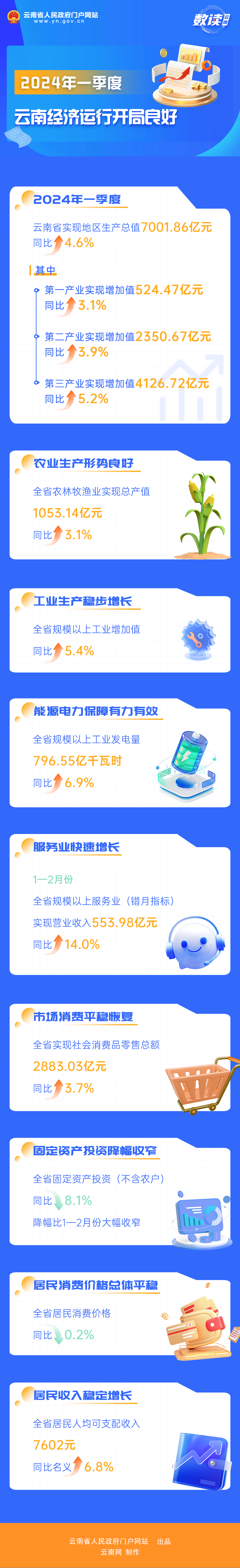 根據(jù)地區(qū)生產(chǎn)總值統(tǒng)一核算結(jié)果,2024年一季度云南省實(shí)現(xiàn)地區(qū)生產(chǎn)總值7001.86億元,同比增長(zhǎng)4.6%。其中,第一產(chǎn)業(yè)實(shí)現(xiàn)增加值524.47億元,同比增長(zhǎng)3.1%;第二產(chǎn)業(yè)實(shí)現(xiàn)增加值2350.67億元,增長(zhǎng)3.9%;第三產(chǎn)業(yè)實(shí)現(xiàn)增加值4126.72億元,增長(zhǎng)5.2%。