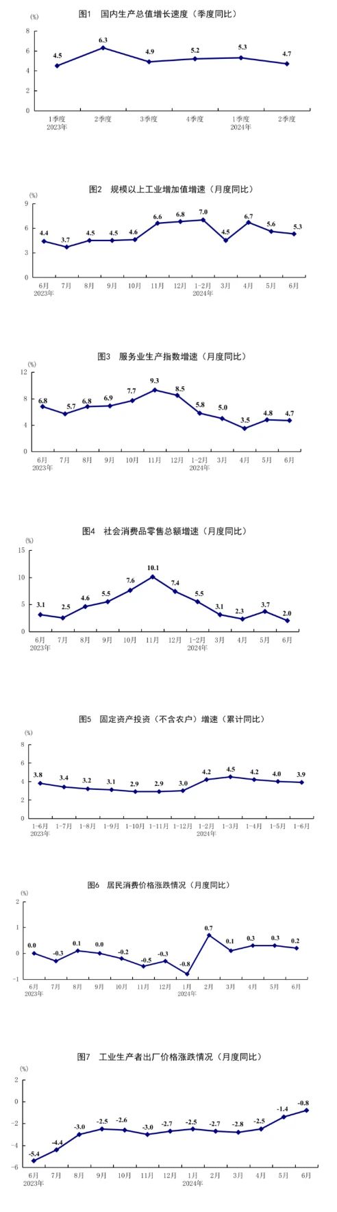 2023年各季度及2024年一季度、二季度GDP環(huán)比增速分別為1.8%、0.8%、1.5%、1.2%、1.5%和0.7%。