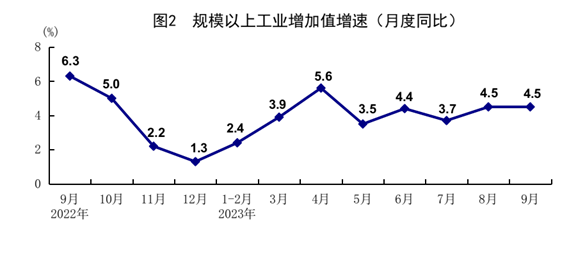 前三季度,全國規(guī)模以上工業(yè)增加值同比增長4.0%,比上半年加快0.2個(gè)百分點(diǎn)。分三大門類看,采礦業(yè)增加值同比增長1.7%,制造業(yè)增長4.4%,電力、熱力、燃?xì)饧八a(chǎn)和供應(yīng)業(yè)增長3.5%。裝備制造業(yè)增加值增長6.0%,比全部規(guī)模以上工業(yè)快2.0個(gè)百分點(diǎn)。分經(jīng)濟(jì)類型看,國有控股企業(yè)增加值同比增長4.6%;股份制企業(yè)增長4.8%,外商及港澳臺(tái)商投資企業(yè)增長0.5%;私營企業(yè)增長2.3%。分產(chǎn)品看,太陽能電池、充電樁、新能源汽車產(chǎn)量分別增長63.2%、34.2%、26.7%。9月份,規(guī)模以上工業(yè)增加值同比增長4.5%,增速與上月持平,比7月份加快0.8個(gè)百分點(diǎn);環(huán)比增長0.36%。1-8月份,全國規(guī)模以上工業(yè)企業(yè)實(shí)現(xiàn)利潤總額同比下降11.7%,降幅比上半年收窄5.1個(gè)百分點(diǎn),其中8月份同比增長17.2%。9月份,制造業(yè)采購經(jīng)理指數(shù)為50.2%,比上月上升0.5個(gè)百分點(diǎn),企業(yè)生產(chǎn)經(jīng)營活動(dòng)預(yù)期指數(shù)為55.5%。