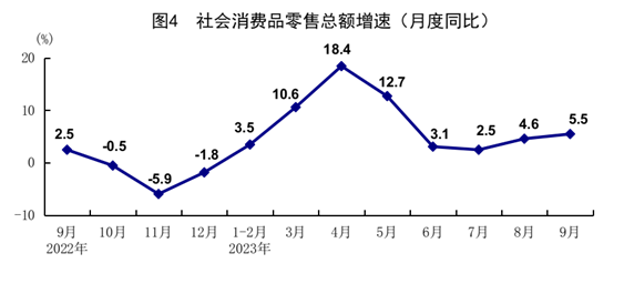 前三季度,社會(huì)消費(fèi)品零售總額342107億元,同比增長6.8%。按經(jīng)營單位所在地分,城鎮(zhèn)消費(fèi)品零售額296410億元,同比增長6.7%;鄉(xiāng)村消費(fèi)品零售額45697億元,增長7.4%。按消費(fèi)類型分,商品零售305002億元,增長5.5%;餐飲收入37105億元,增長18.7%?;旧铑惿唐蜂N售穩(wěn)定增長,限額以上單位服裝鞋帽針紡織品類、糧油食品類商品零售額分別增長10.6%、5.3%。升級(jí)類商品銷售較快增長,限額以上單位金銀珠寶類、體育娛樂用品類、化妝品類商品零售額分別增長12.2%、8.3%、6.8%。全國網(wǎng)上零售額108198億元,同比增長11.6%。其中,實(shí)物商品網(wǎng)上零售額90435億元,增長8.9%,占社會(huì)消費(fèi)品零售總額的比重為26.4%。9月份,社會(huì)消費(fèi)品零售總額同比增長5.5%,比上月加快0.9個(gè)百分點(diǎn),增速連續(xù)2個(gè)月加快;環(huán)比增長0.02%。前三季度,服務(wù)零售額同比增長18.9%。