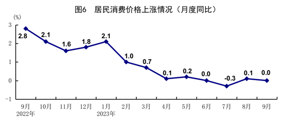 前三季度,全國居民消費(fèi)價(jià)格(CPI)同比上漲0.4%。分類別看,食品煙酒價(jià)格上漲1.1%,衣著價(jià)格上漲0.9%,居住價(jià)格下降0.1%,生活用品及服務(wù)價(jià)格上漲0.2%,交通通信價(jià)格下降2.4%,教育文化娛樂價(jià)格上漲1.9%,醫(yī)療保健價(jià)格上漲1.1%,其他用品及服務(wù)價(jià)格上漲3.2%。在食品煙酒價(jià)格中,豬肉價(jià)格下降6.8%,鮮菜價(jià)格下降3.1%,糧食價(jià)格上漲1.2%,鮮果價(jià)格上漲6.0%??鄢称泛湍茉磧r(jià)格后的核心CPI同比上漲0.7%。9月份,全國居民消費(fèi)價(jià)格同比持平,環(huán)比上漲0.2%。