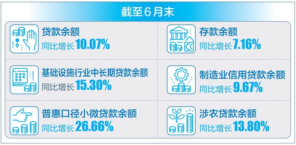 聚焦有效投資及重點領域,截至6月末,全省基礎設施行業(yè)中長期貸款余額1.06萬億元,同比增長15.30%;涉農(nóng)貸款余額1.38萬億元,同比增長13.80%;綠色貸款余額4510.97億元,同比增長24.72%;制造業(yè)信用貸款余額846.39億元,同比增長9.67%,占制造業(yè)貸款的比重為47.98%。