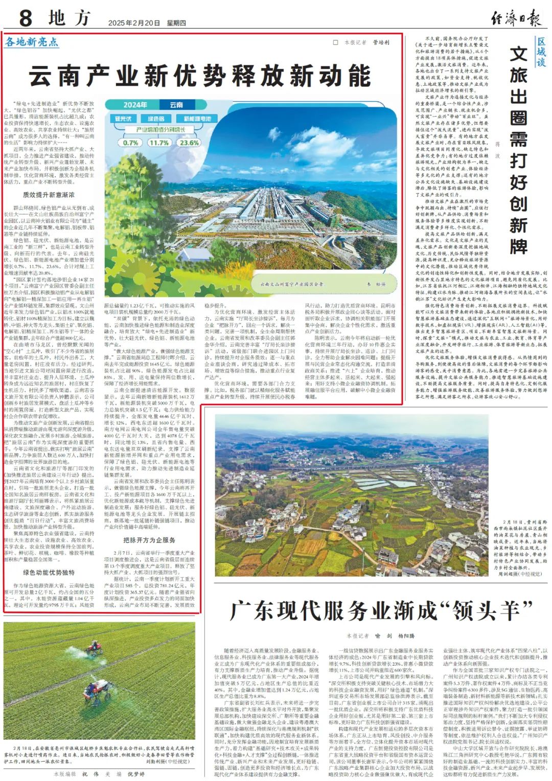 “綠電+先進(jìn)制造業(yè)”新優(yōu)勢(shì)不斷放大,“綠色鋁谷”加快崛起,“光伏之都”已具雛形,清潔能源裝機(jī)占比超九成;農(nóng)業(yè)投資保持快速增長(zhǎng),生態(tài)農(nóng)業(yè)、設(shè)施農(nóng)業(yè)、高效農(nóng)業(yè)、共享農(nóng)業(yè)持續(xù)壯大;“旅居云南”成為很多人的選擇,“有一種叫云南的生活”影響力持續(xù)擴(kuò)大……