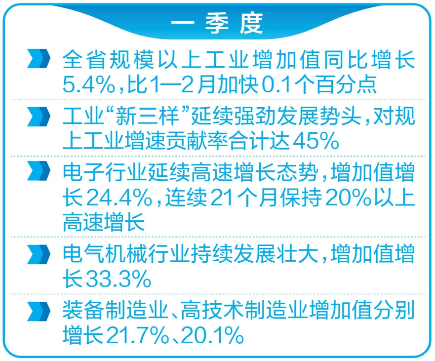 傳統(tǒng)行業(yè)支撐有力,優(yōu)勢產(chǎn)業(yè)集聚成勢,新興產(chǎn)業(yè)高速增長。今年以來,我省大抓產(chǎn)業(yè)、主攻工業(yè),緊緊扭住“八個關(guān)鍵性抓手”,聚力推進(jìn)“四大支撐性工程”,加快構(gòu)建現(xiàn)代化工業(yè)體系,工業(yè)經(jīng)濟(jì)穩(wěn)中有進(jìn),新動能加速蓄積。統(tǒng)計(jì)數(shù)據(jù)顯示,一季度,全省規(guī)模以上工業(yè)增加值同比增長5.4%,比1—2月加快0.1個百分點(diǎn)。