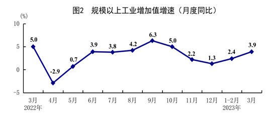 一季度,全國(guó)規(guī)模以上工業(yè)增加值同比增長(zhǎng)3.0%,比上年四季度加快0.3個(gè)百分點(diǎn)。分三大門(mén)類(lèi)看,采礦業(yè)增加值增長(zhǎng)3.2%,制造業(yè)增長(zhǎng)2.9%,電力、熱力、燃?xì)饧八a(chǎn)和供應(yīng)業(yè)增長(zhǎng)3.3%。裝備制造業(yè)增加值增長(zhǎng)4.3%,比1-2月份加快2.5個(gè)百分點(diǎn)。分經(jīng)濟(jì)類(lèi)型看,國(guó)有控股企業(yè)增加值增長(zhǎng)3.3%;股份制企業(yè)增長(zhǎng)4.3%,外商及港澳臺(tái)商投資企業(yè)下降2.7%;私營(yíng)企業(yè)增長(zhǎng)2.0%。分產(chǎn)品看,太陽(yáng)能電池、新能源汽車(chē)產(chǎn)量分別增長(zhǎng)53.2%、22.5%。3月份,規(guī)模以上工業(yè)增加值同比增長(zhǎng)3.9%,比1-2月份加快1.5個(gè)百分點(diǎn);環(huán)比增長(zhǎng)0.12%。3月份,制造業(yè)采購(gòu)經(jīng)理指數(shù)為51.9%,企業(yè)生產(chǎn)經(jīng)營(yíng)活動(dòng)預(yù)期指數(shù)為55.5%。1-2月份,全國(guó)規(guī)模以上工業(yè)企業(yè)實(shí)現(xiàn)利潤(rùn)總額8872億元,同比下降22.9%。