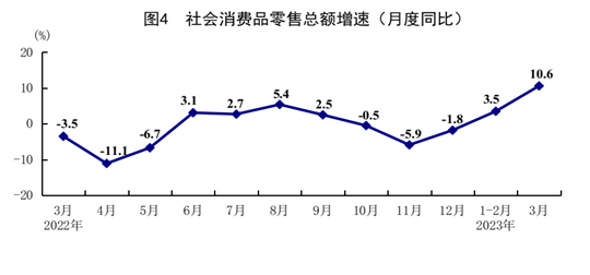 一季度,社會(huì)消費(fèi)品零售總額114922億元,同比增長(zhǎng)5.8%,上年四季度為下降2.7%。按經(jīng)營(yíng)單位所在地分,城鎮(zhèn)消費(fèi)品零售額99664億元,增長(zhǎng)5.7%;鄉(xiāng)村消費(fèi)品零售額15258億元,增長(zhǎng)6.2%。按消費(fèi)類(lèi)型分,商品零售102786億元,增長(zhǎng)4.9%;餐飲收入12136億元,增長(zhǎng)13.9%。基本生活類(lèi)商品銷(xiāo)售良好,限額以上單位服裝鞋帽針紡織品類(lèi)、糧油食品類(lèi)商品零售額分別增長(zhǎng)9.0%、7.5%。升級(jí)類(lèi)商品銷(xiāo)售大幅增長(zhǎng),限額以上單位金銀珠寶類(lèi)、書(shū)報(bào)雜志類(lèi)商品零售額分別增長(zhǎng)13.6%、13.4%。全國(guó)網(wǎng)上零售額32863億元,增長(zhǎng)8.6%。其中,實(shí)物商品網(wǎng)上零售額27835億元,增長(zhǎng)7.3%,占社會(huì)消費(fèi)品零售總額的比重為24.2%。3月份,社會(huì)消費(fèi)品零售總額同比增長(zhǎng)10.6%,比1-2月份加快7.1個(gè)百分點(diǎn);環(huán)比增長(zhǎng)0.15%。