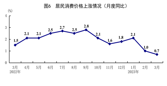 一季度,全國(guó)居民消費(fèi)價(jià)格(CPI)同比上漲1.3%。分類(lèi)別看,食品煙酒價(jià)格上漲2.9%,衣著價(jià)格上漲0.7%,居住價(jià)格下降0.2%,生活用品及服務(wù)價(jià)格上漲1.2%,交通通信價(jià)格上漲0.1%,教育文化娛樂(lè)價(jià)格上漲1.7%,醫(yī)療保健價(jià)格上漲0.9%,其他用品及服務(wù)價(jià)格上漲2.7%。在食品煙酒價(jià)格中,鮮果價(jià)格上漲11.0%,豬肉價(jià)格上漲8.5%,糧食價(jià)格上漲2.5%,鮮菜價(jià)格下降2.9%。扣除食品和能源價(jià)格后的核心CPI同比上漲0.8%。3月份,全國(guó)居民消費(fèi)價(jià)格同比上漲0.7%,環(huán)比下降0.3%。