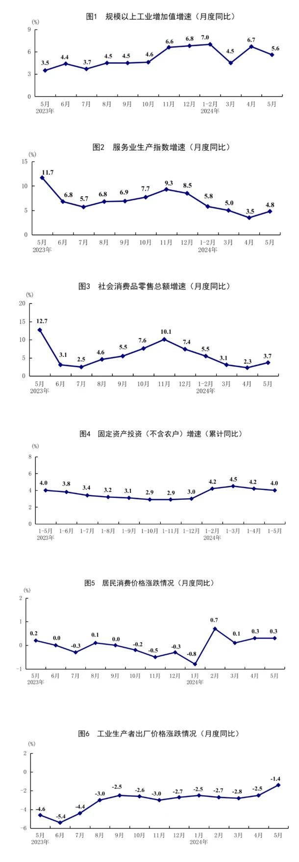 總的來(lái)看,5月份,經(jīng)濟(jì)運(yùn)行總體平穩(wěn),主要指標(biāo)有所回升,新動(dòng)能較快成長(zhǎng)。但也要看到,當(dāng)前外部環(huán)境復(fù)雜嚴(yán)峻,國(guó)內(nèi)有效需求依然不足,經(jīng)濟(jì)持續(xù)回升向好仍面臨諸多困難挑戰(zhàn)。下階段,要堅(jiān)持以習(xí)近平新時(shí)代中國(guó)特色社會(huì)主義思想為指導(dǎo),堅(jiān)持穩(wěn)中求進(jìn)工作總基調(diào),完整、準(zhǔn)確、全面貫徹新發(fā)展理念,加快構(gòu)建新發(fā)展格局,著力推動(dòng)高質(zhì)量發(fā)展,靠前發(fā)力有效落實(shí)已經(jīng)確定的宏觀政策,因地制宜發(fā)展新質(zhì)生產(chǎn)力,堅(jiān)定不移深化改革擴(kuò)大開(kāi)放,鞏固和增強(qiáng)經(jīng)濟(jì)回升向好態(tài)勢(shì),持續(xù)推動(dòng)經(jīng)濟(jì)實(shí)現(xiàn)質(zhì)的有效提升和量的合理增長(zhǎng)。