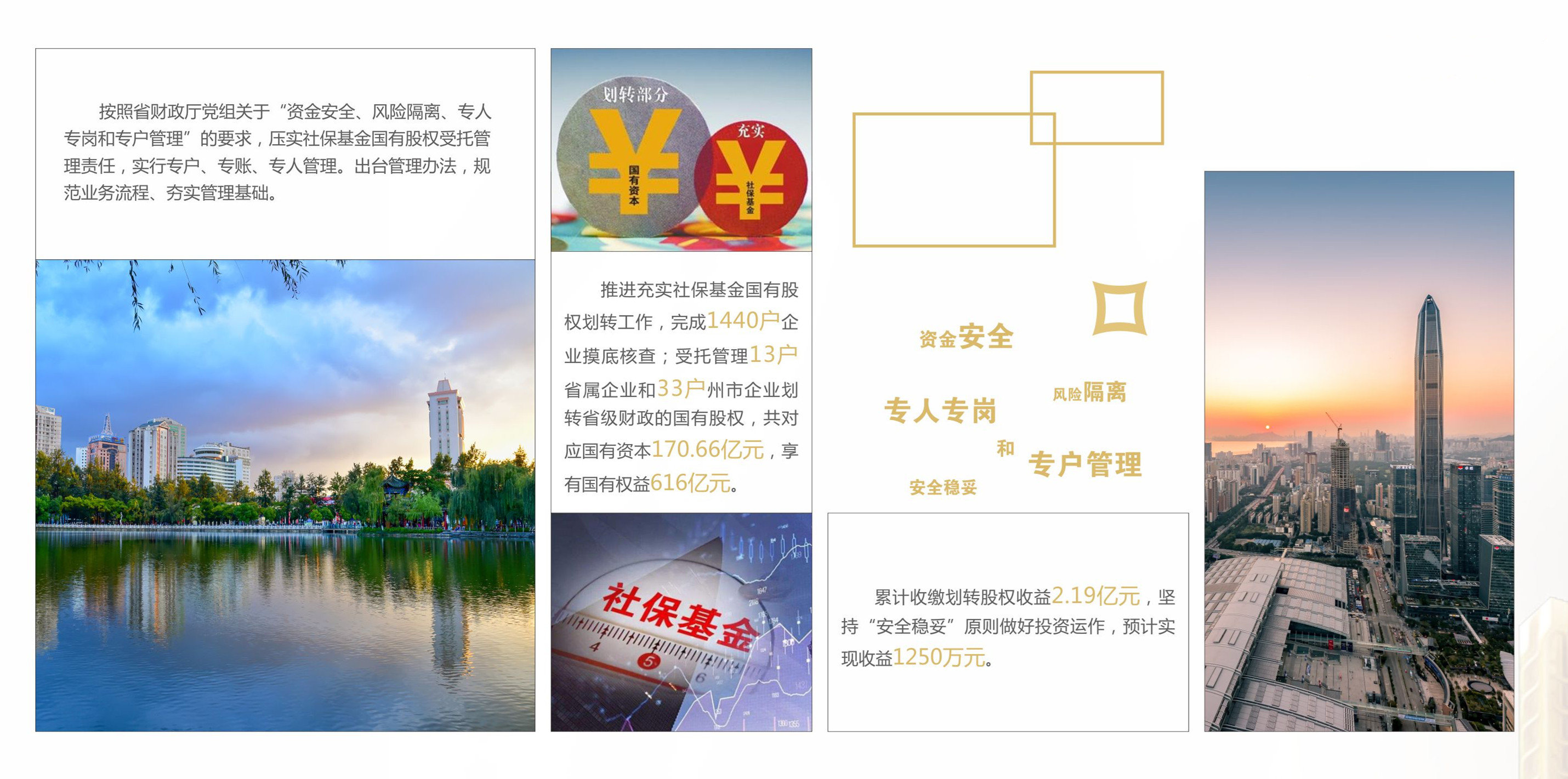 按照省財(cái)政廳黨組“資金安全、風(fēng)險(xiǎn)隔離、專人專崗和專戶管理”的要求,集團(tuán)緊扣職能定位,加強(qiáng)統(tǒng)籌謀劃,單獨(dú)成立社保資產(chǎn)管理中心,壓實(shí)受托管理責(zé)任。聚焦劃轉(zhuǎn)股權(quán)后續(xù)管理,積極構(gòu)建“1+2+4”管理制度體系,規(guī)范業(yè)務(wù)流程、夯實(shí)管理基礎(chǔ)。全國首家出臺專戶會(huì)計(jì)核算辦法,嚴(yán)格實(shí)行專戶、專賬、專人管理,確保資金安全。完成1440戶企業(yè)摸底核查,受托管理13戶省屬企業(yè)和33戶州市企業(yè)劃轉(zhuǎn)省級財(cái)政的國有股權(quán),共對應(yīng)國有資本171億元,享有國有權(quán)益616億元。累計(jì)收取分紅收益3.16億元,按照“安全穩(wěn)妥、兼顧收益”原則,全部完成投資運(yùn)作,預(yù)計(jì)到期收益3287萬元。